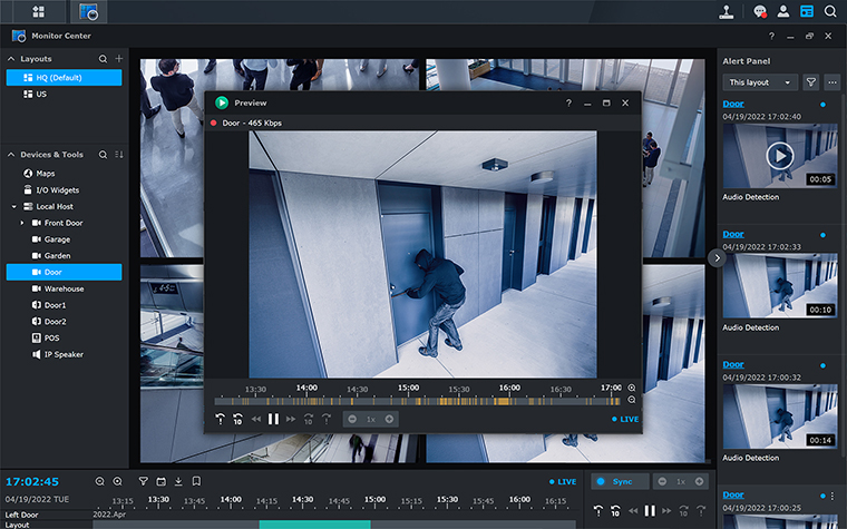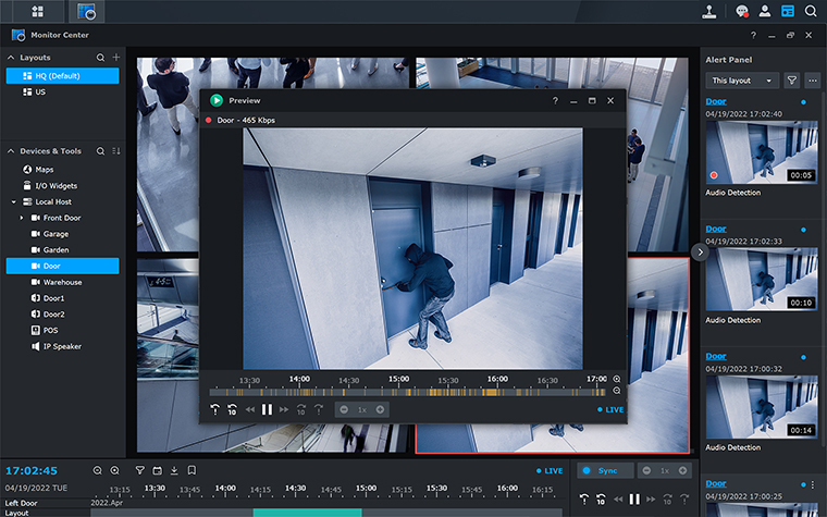 Flexible security dashboardBuild a custom monitoring and control dashboard for all your surveillance and security devices. Flexibly drag and drop, resize, and even swap camera feeds, maps, I/O widgets, and other panels. Access live video feeds, scrub through past recordings, control devices, and get alerts in one unified view.MapsControl all devices in your deployment, monitor you video feeds, and investigate alerts directly on detailed, multi-floor maps to gain a more accurate picture of what happens on premises.AlertsBe alerted when events are triggered, follow the situation in real time, immediately replay relevant recordings, and react faster with the Alert Panel in your Monitor Center.I/O widgetsOperate sirens and speakers, door locks, LED lights, and more directly from the main view, without ever taking your eyes off your live camera feeds.TimelineScrub through the past and monitor the present in the same window. Choose a date in the calendar and investigate recordings more effectively.
