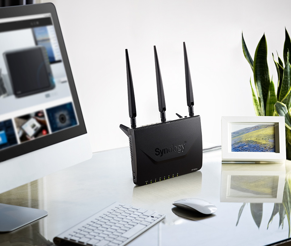 Equipped with three powerful antennas and support for the latest 802.11ac wireless networking standard, Synology Router RT1900ac broadcasts both 2.4 and 5 GHz spectrums for combined data transfer speeds of up to 1900 Mbps. Never worry about speed bottlenecks even when multiple people are connected to the network.